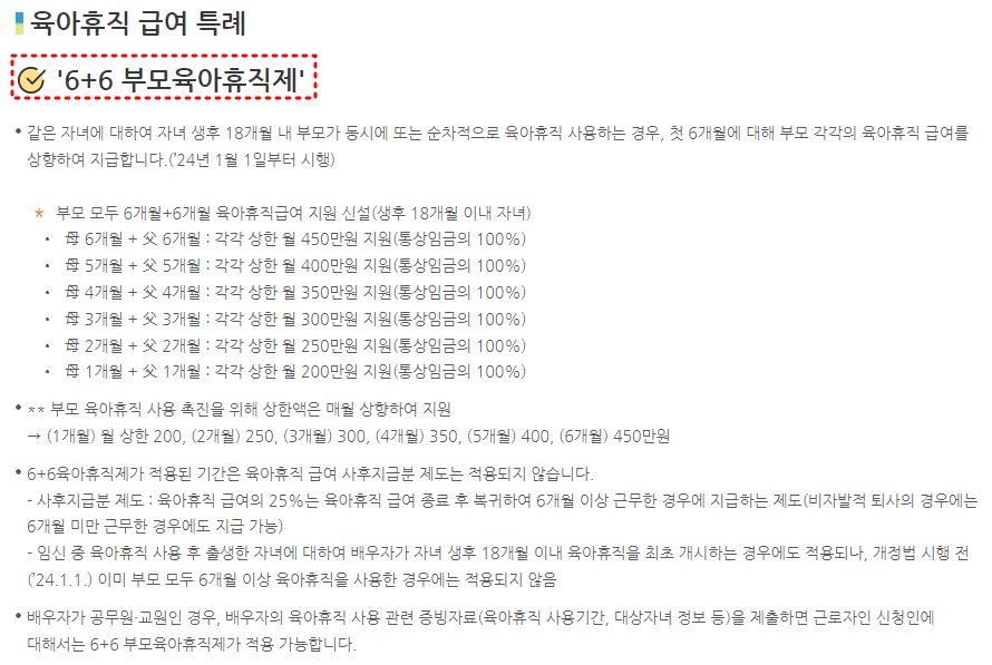 2024년 1월 1일부터 시행된 6+6 부모육아휴직제도로 맞벌이 부모가 조건에 맞게 육아휴직을 사용했을 때, 최대 1,950만원까지 지원받을 수 있습니다.