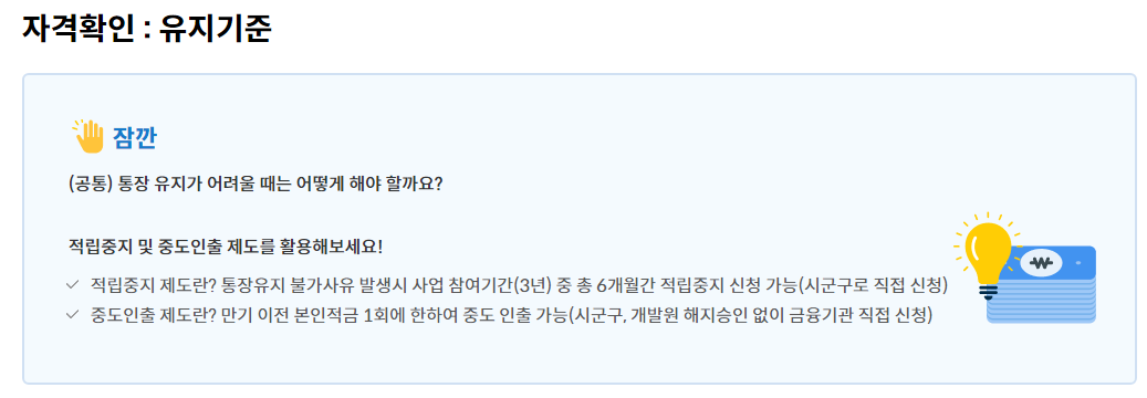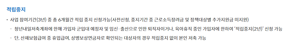 처음 가입한 날로부터 3년 후로 동일하게 유지되지만, 적립 중지 기간 동안에는 정부 지원금이 적립되지 않기 때문에 만기 후 받을 수 있는 총 금액이 줄어들게 되죠.