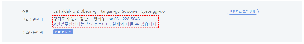 도로명 주소 검색 결과에서 본인의 주소지 끝에 더보기를 클릭하면 관할주민센터 정보 및 연락처를 확인할 수 있습니다.