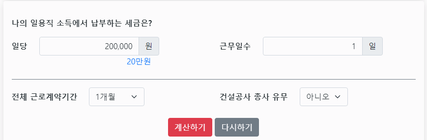 본인이 일용직으로 계약한 기간과 일당, 그리고 근무 일수 등을 입력하면 정해진 계산방법을 통해서 대략적인 일용직 소득세를 구해볼 수 있습니다.