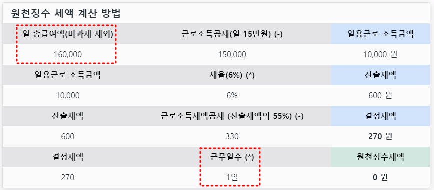 하루 일당이 15만원을 초과하지 않으면 소득공제가 되며, 일당 16만원으로 근무기간을 하루로 잡고 일용직 소득세를 계산해보면 원천징수세액이 없음을 확인할 수 있습니다.